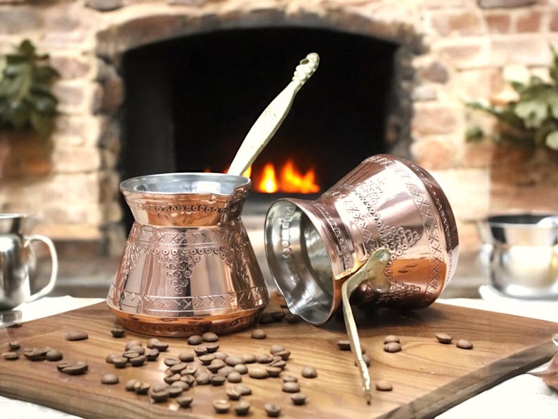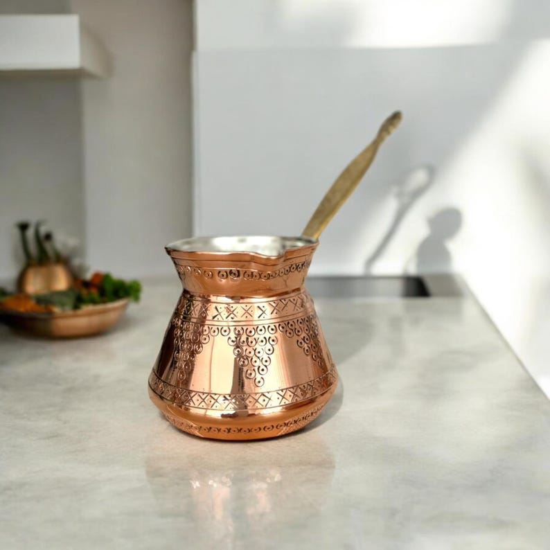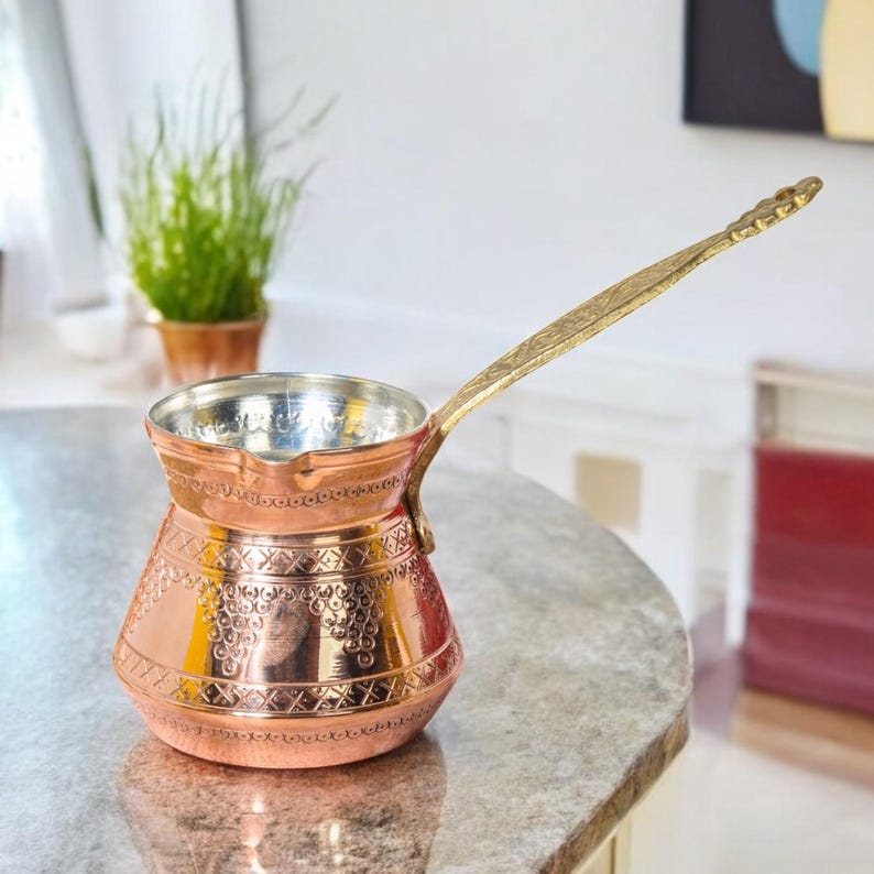 Медная кофеварка для плиты, идеально подходит для приготовления греческого и арабского кофе. Briki также можно использовать для растапливания масла, приготовления соусов, травяного чая и шоколада.